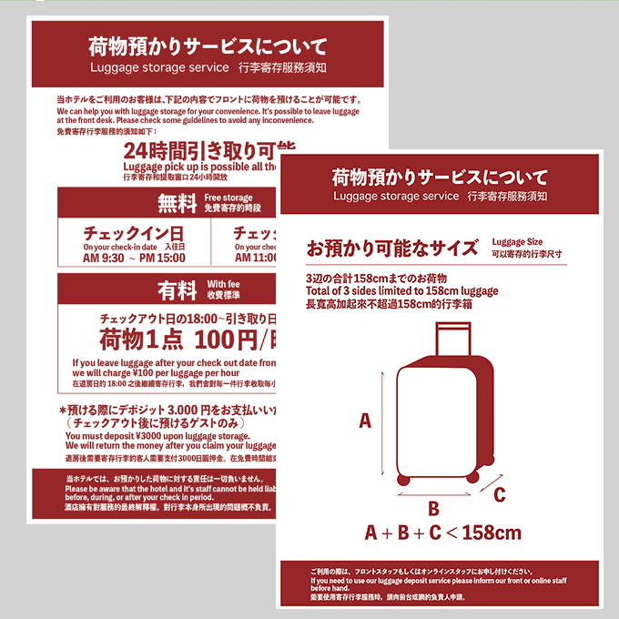荷物預かりについての説明を分かりやすく、日本語、英語、中国語三国語で掲載するポスターをデザインした。