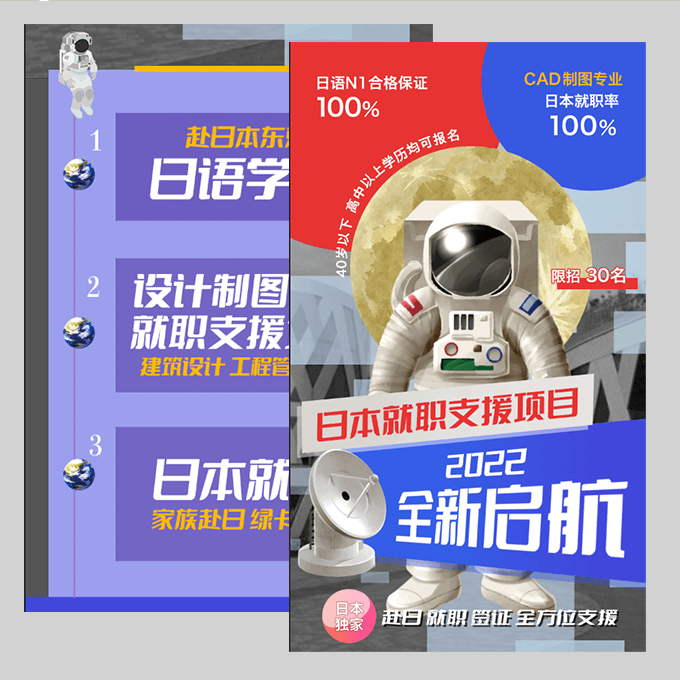 SNS掲載用の留学プラン紹介用の画像を作成しました。若者対象で、宇宙をイメージにしたデザインになります。